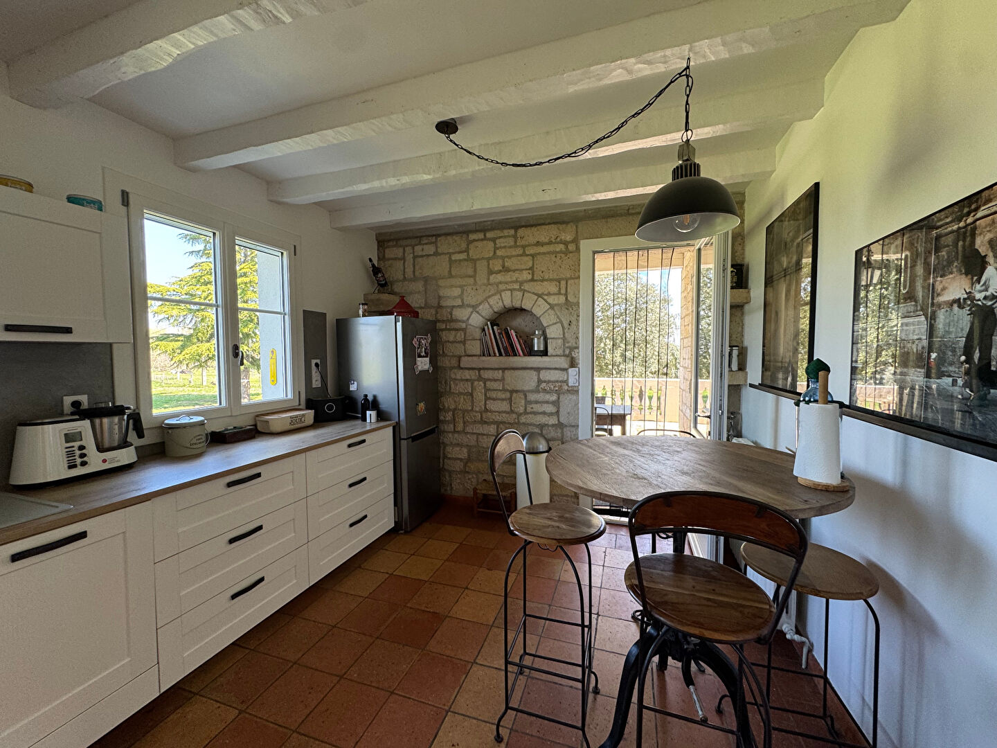 Hall d’entrée, beau séjour avec cheminée équipée d’un insert, cuisine indépendante sur terrasse ombragée